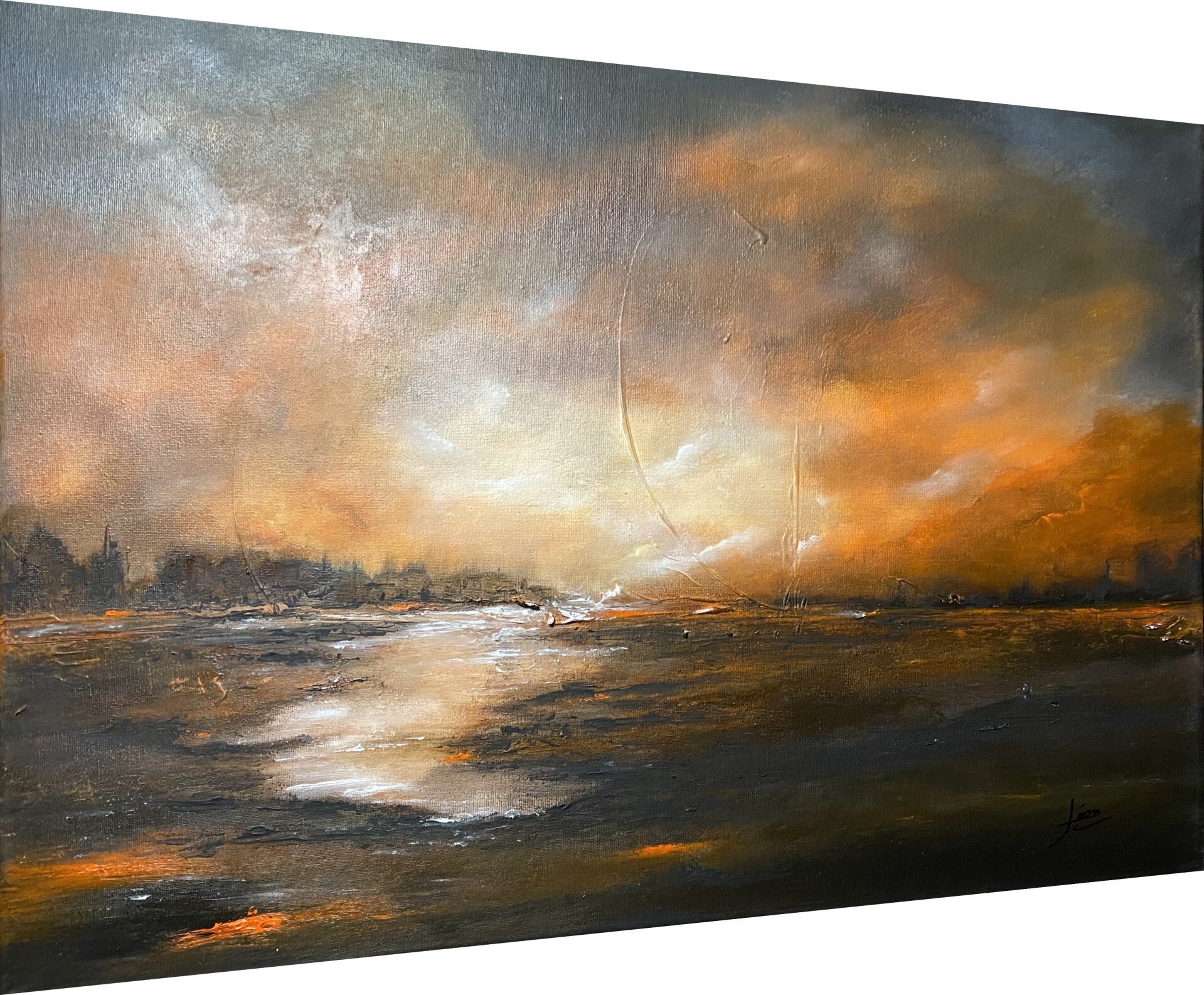 Le Gardien du Crépuscule est une peinture acrylique sur toile (60 x 50 cm) qui capture toute la puissance et la poésie d’un paysage baigné par les dernières lueurs du jour. Ce tableau fascinant joue avec des contrastes intenses : des teintes ardentes d’orange et d’ocre embrasent le ciel tandis que des ombres profondes ancrent la composition dans une atmosphère mystique.