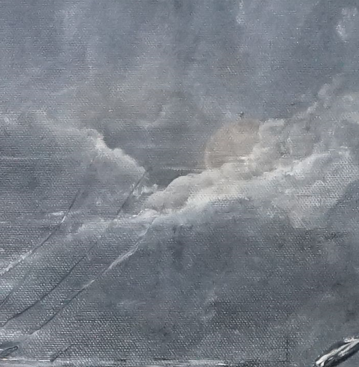 Ce tableau fascinant joue avec des contrastes subtils : des bleus marines profonds et des gris anthracite enveloppent la scène, créant une atmosphère à la fois sereine et envoûtante.