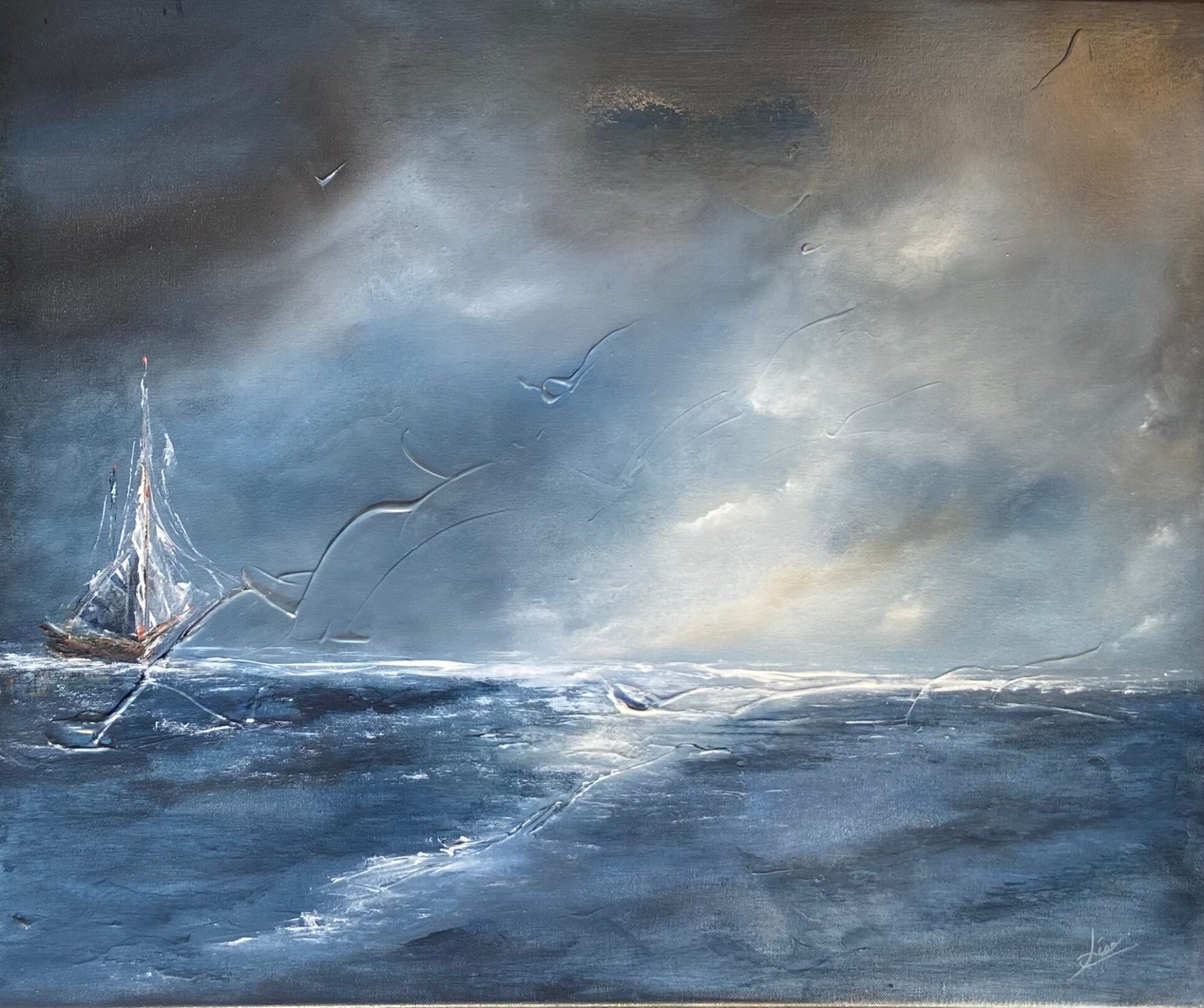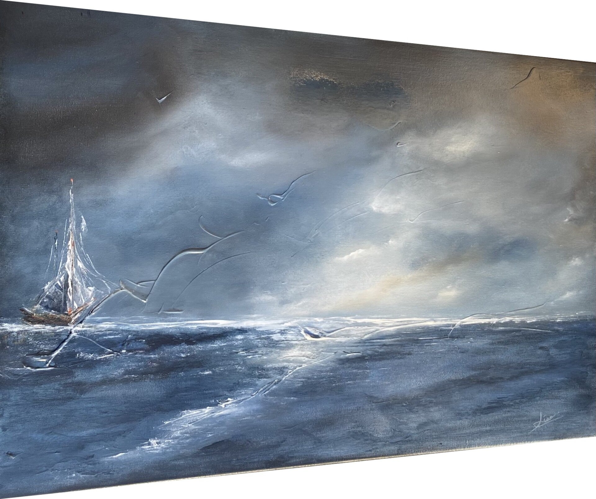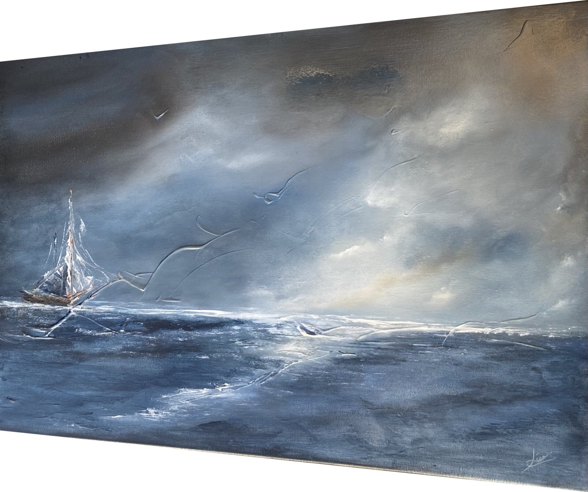 Seul, face à l’immensité est une peinture acrylique sur toile (60 x 50 cm) qui capte toute la grandeur et la puissance de l’océan. Ce tableau saisissant dépeint un voilier solitaire affrontant l’immensité d’une mer aux reflets argentés, sous un ciel où la lumière perce à travers les nuages. Les nuances de bleu profond et de gris nuageux confèrent à l’ensemble une atmosphère à la fois apaisante et introspective.