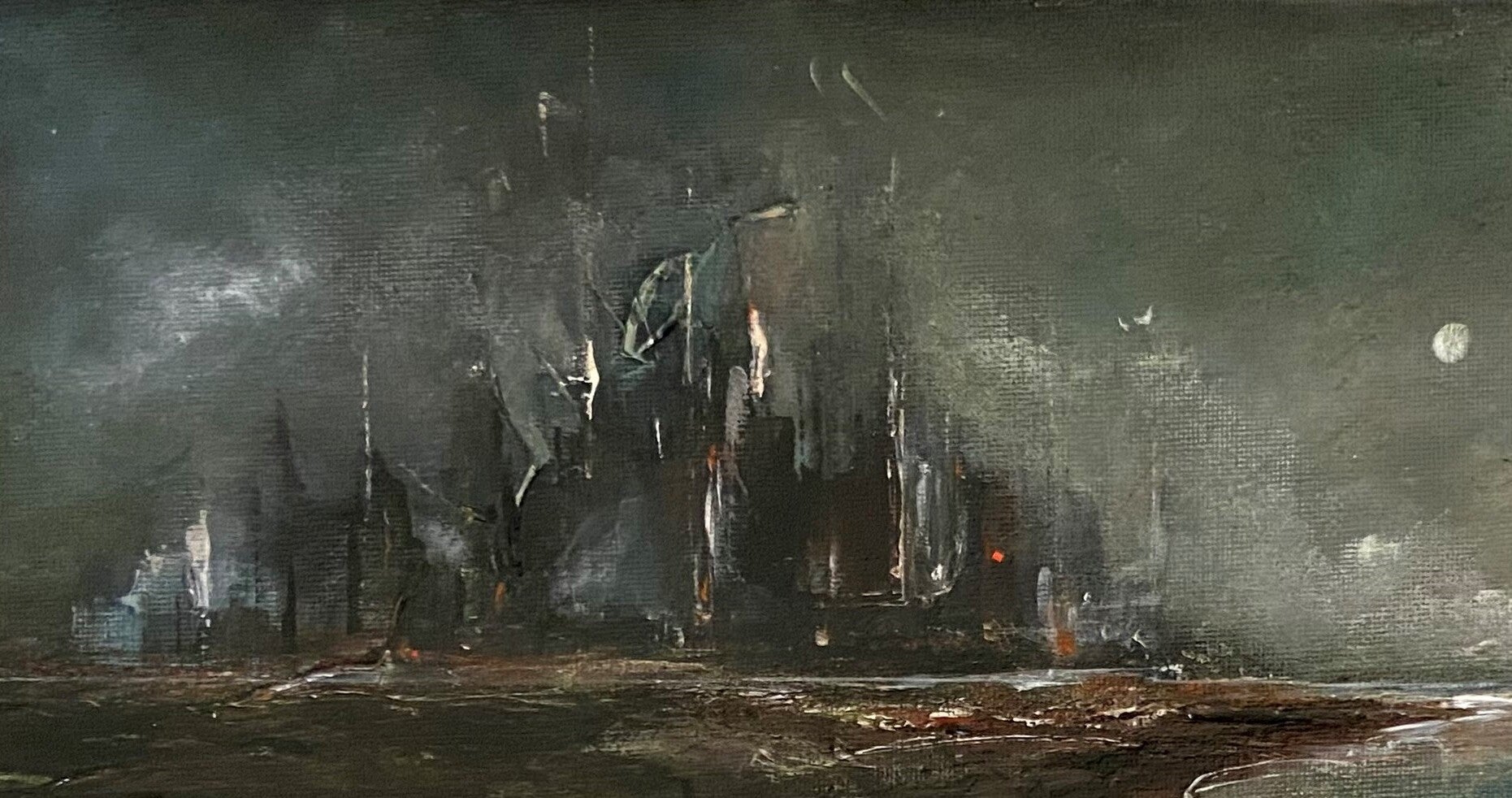 La Cité des Mirages est une peinture acrylique sur toile (50 x 20 cm) qui invite à l’exploration d’un monde fascinant, entre rêve et réalité. Sous un ciel embrumé, deux cités majestueuses s’élèvent, baignées dans une lumière douce et énigmatique. La lune veille sur ces silhouettes élancées, comme si le temps s’était suspendu, laissant place à une cité endormie, prête à s’éveiller.