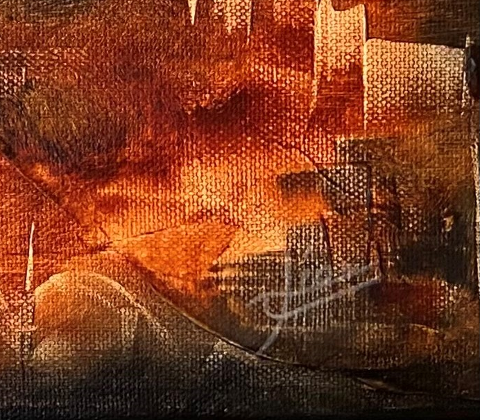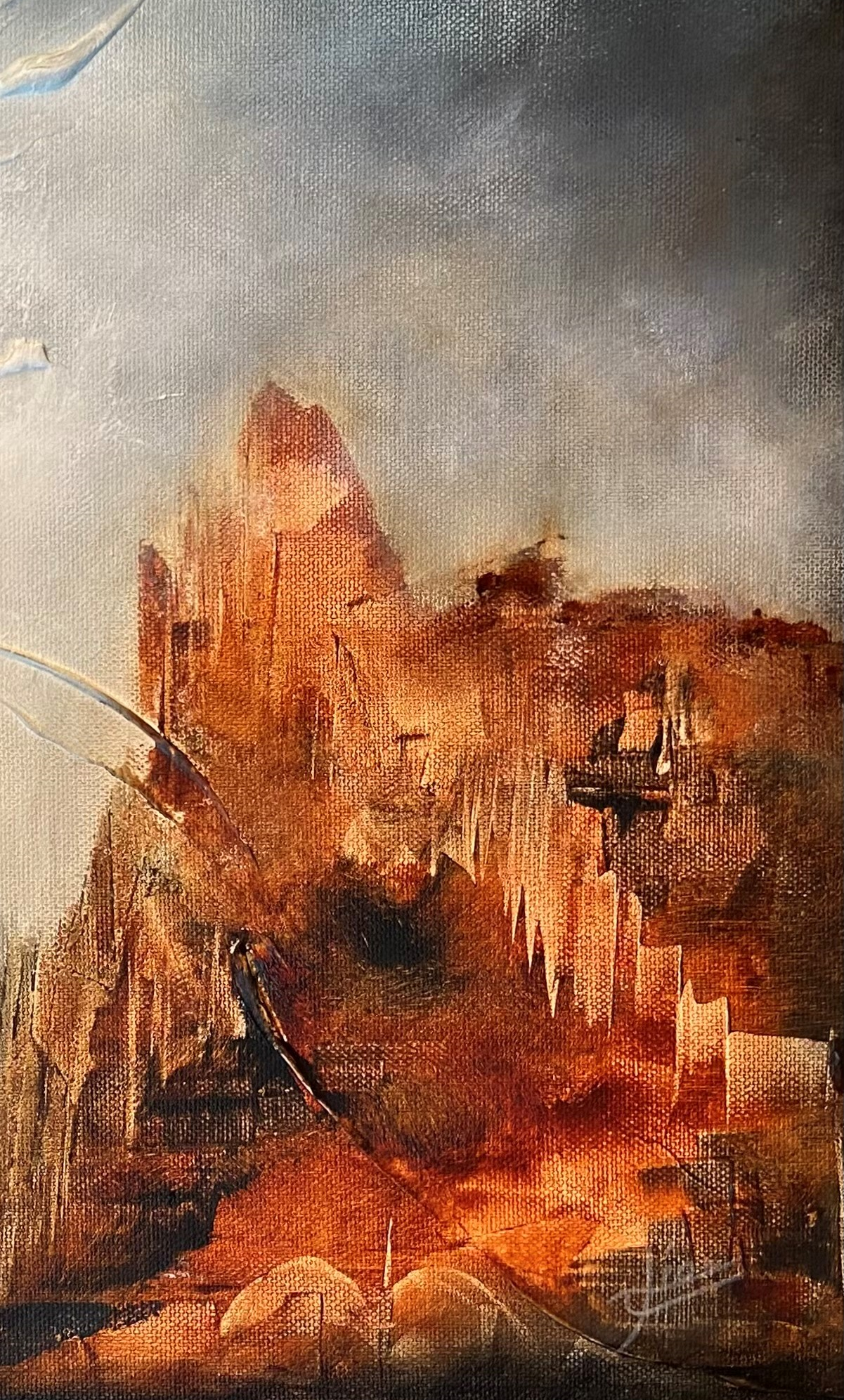 L’Éveil des Titans est une peinture acrylique sur toile (46 x 38 cm) qui capture l’instant où deux puissances s’affrontent ou s’unissent dans un équilibre subtil. Entre ciel et terre, deux mondes se dressent face à face : à gauche, une forteresse de glace, aux arêtes acérées comme des cristaux, émerge d’un voile brumeux, tandis qu’à droite, une cité de feu et de roche s’érige dans une lumière vibrante.
