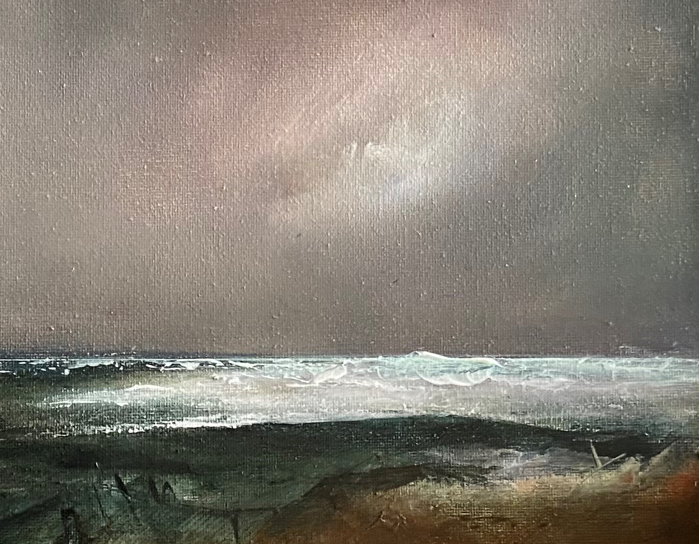 Au premier plan, des teintes terreuses et profondes contrastent avec l’éclat nacré des vagues, tandis qu’un ciel tourmenté laisse entrevoir une lumière subtile, promesse d’accalmie et de renouveau. La texture délicate et les nuances travaillées donnent une impression de mouvement perpétuel, comme si le vent et l’eau dansaient sur la toile.